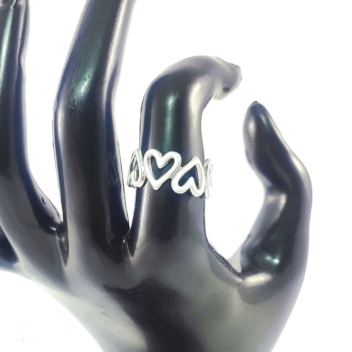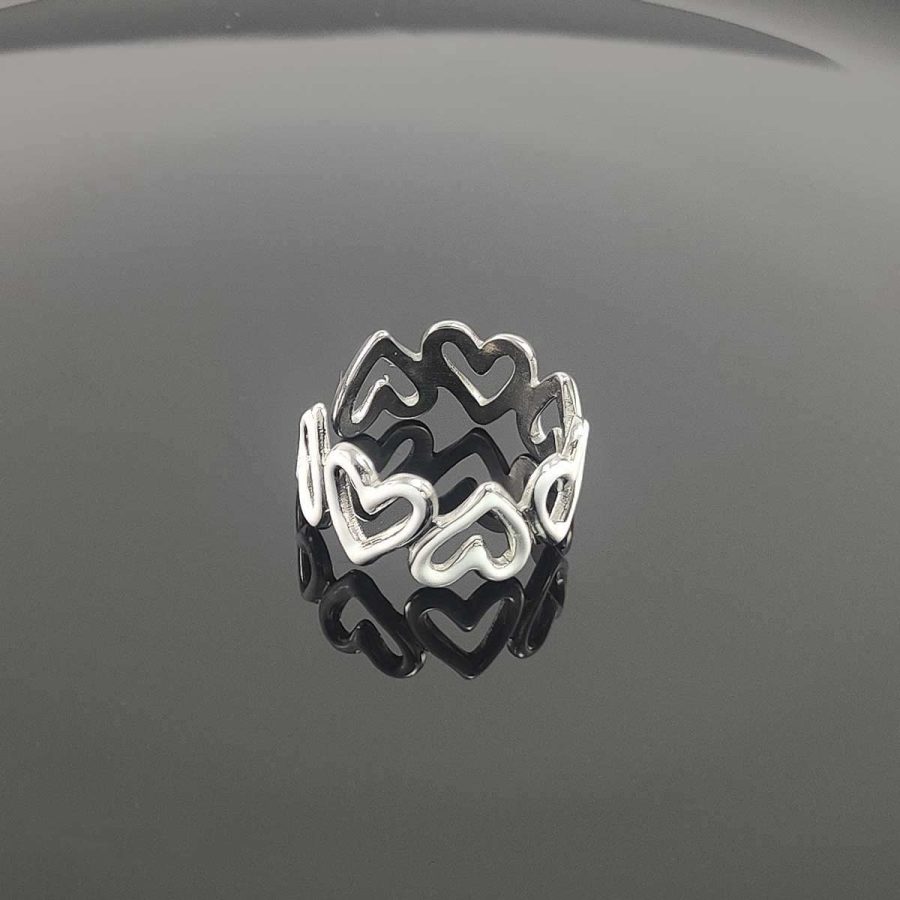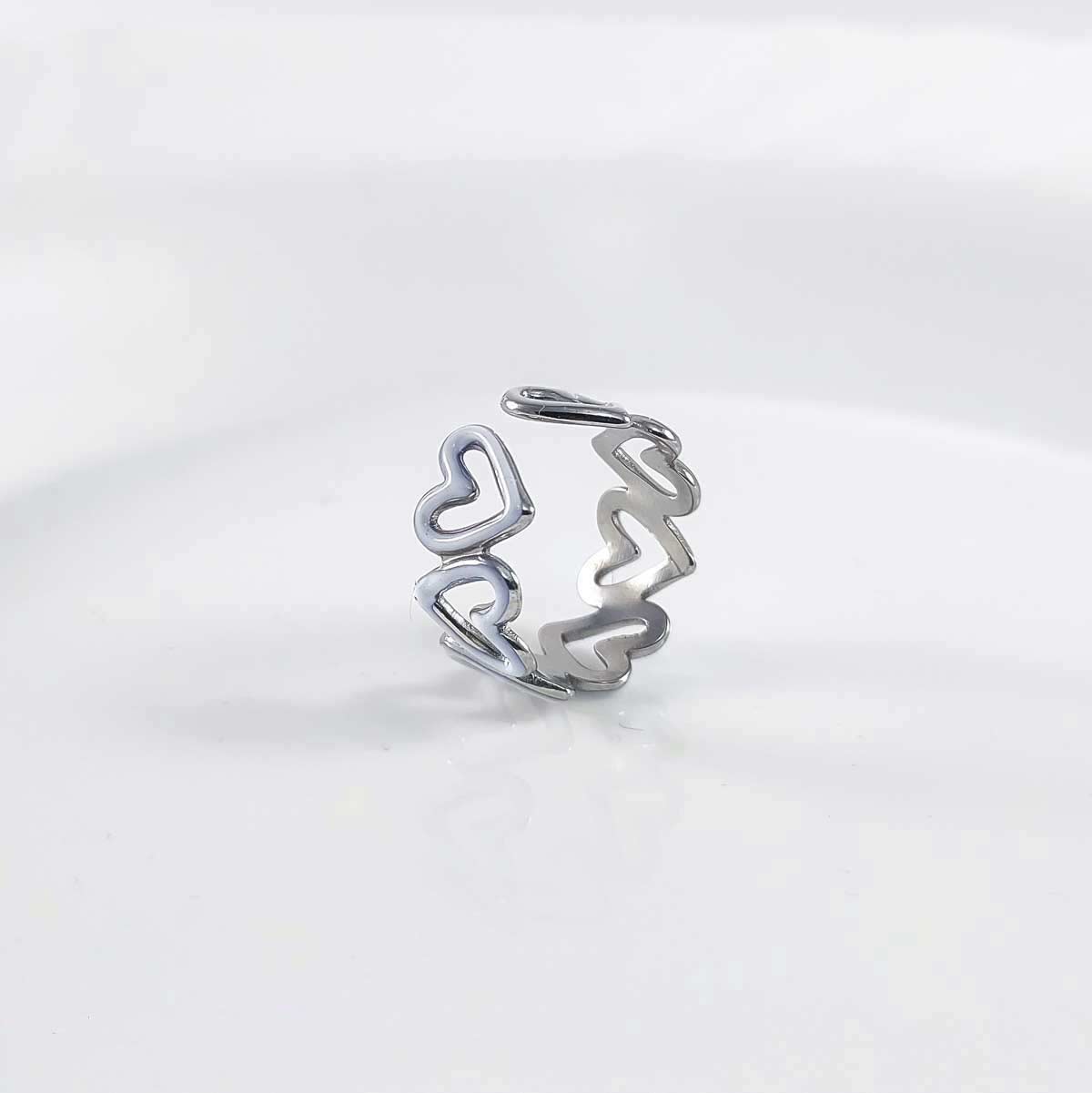 Beli ženski prsten sa srcima. Ovaj model je univerzalan, može da se raširi i skupi po potrebi što znači da će odgovarati skoro svima. Materijal je hirurški čelik odličnog kvaliteta. Uz prsten se dobija ukrasna kutija sa mašnom, takođe dobijate i kartonsku kesicu za poklon.