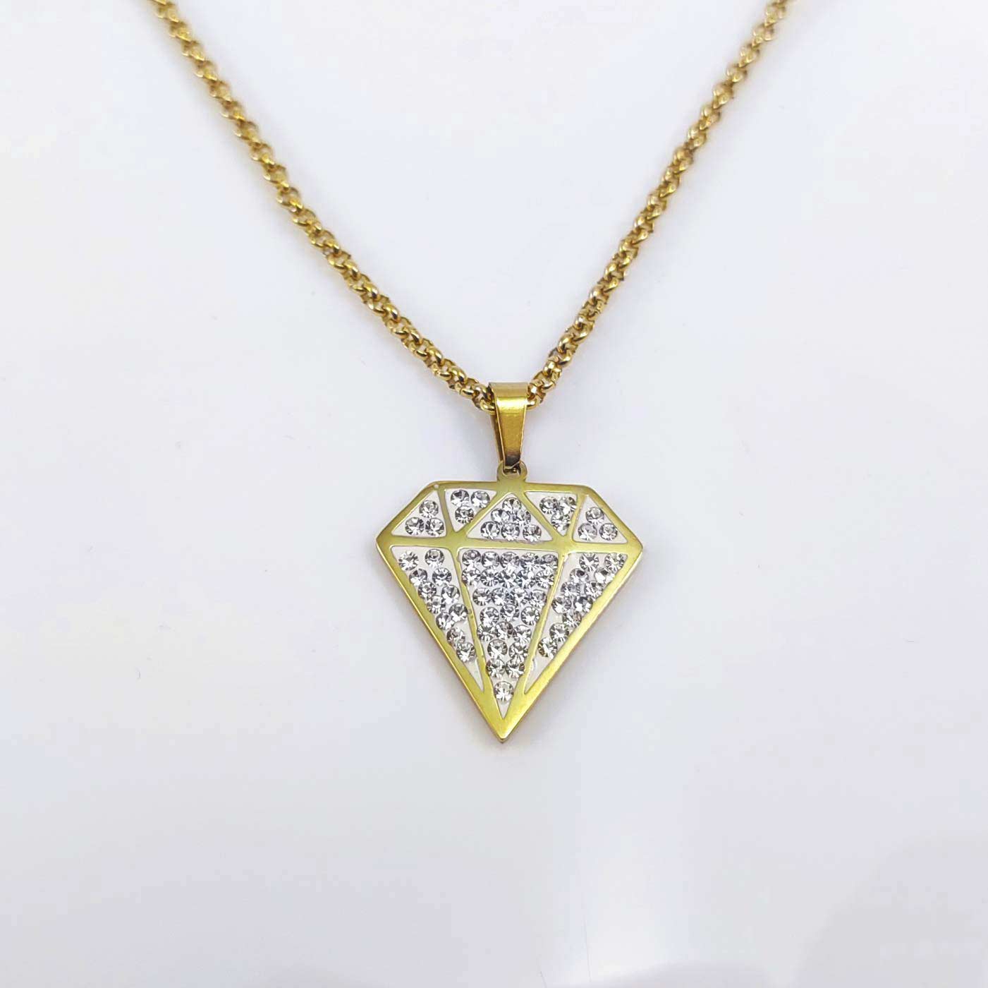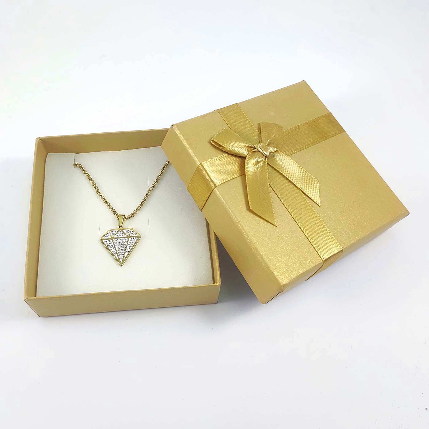 Lančić sa priveskom u obliku dijamanta, prekriven cirkonima. Dimenzije priveska su 20 x 20 mm, lančić je dužine 45 cm + 5 cm produžetak. Kupovinom ovog modela dobijate i ukrasnu kutiju u nekoj od trenutno dostupnih boja.