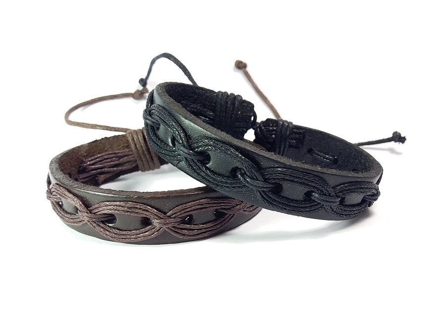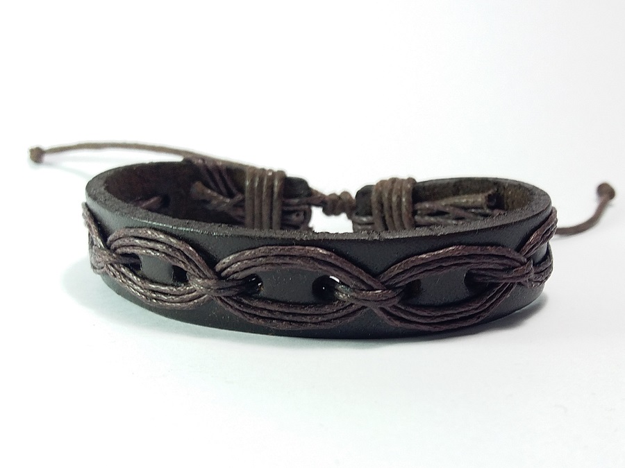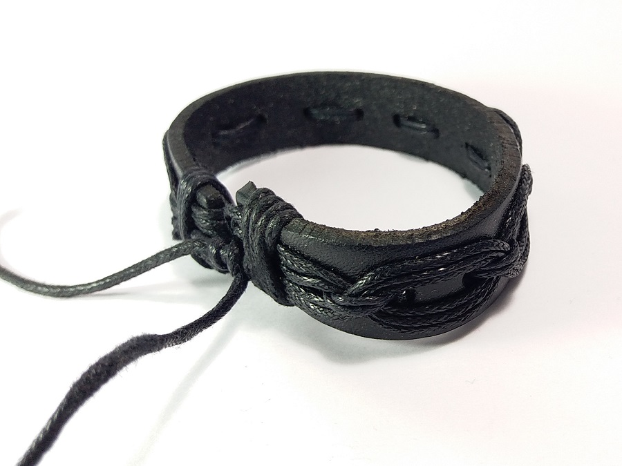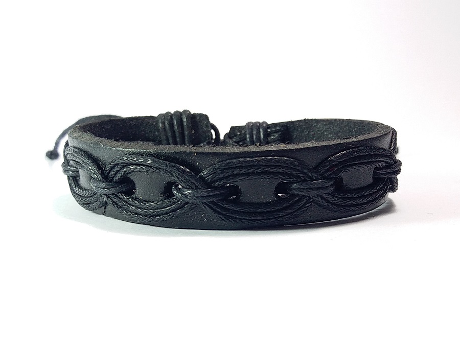 Crna ili tamno braon kožna narukvica namenjena muškarcima. Narukvica je širine 1.2 cm, minimalnog obima 16 cm. Ima kanap za podešavanje tako da se može raširiti koliko god je potrebno.