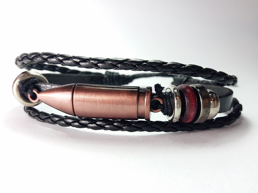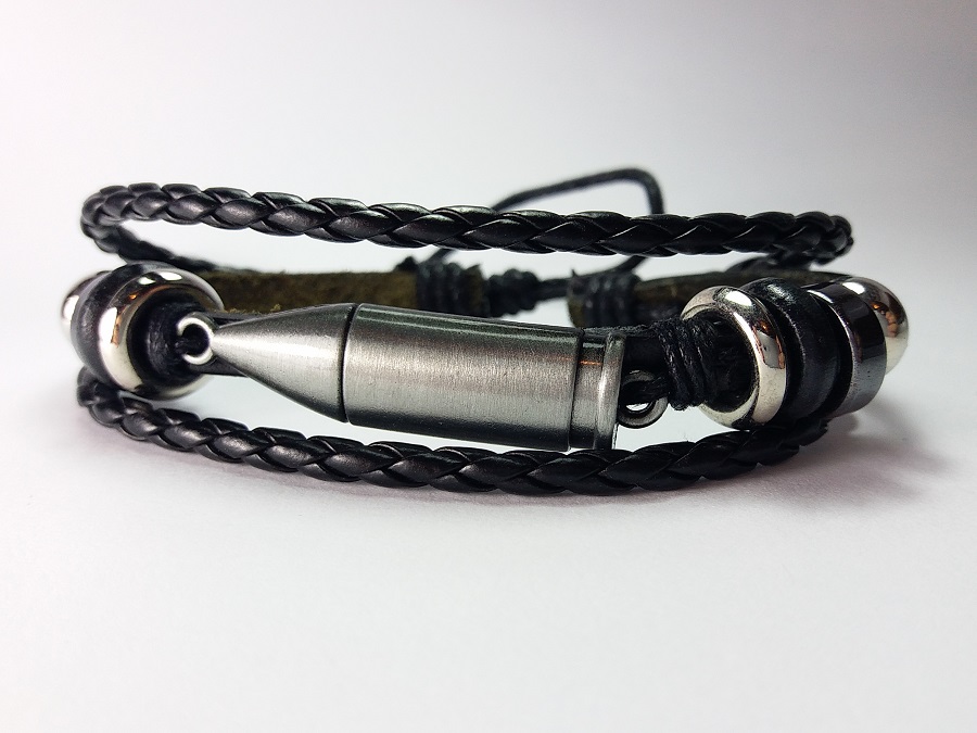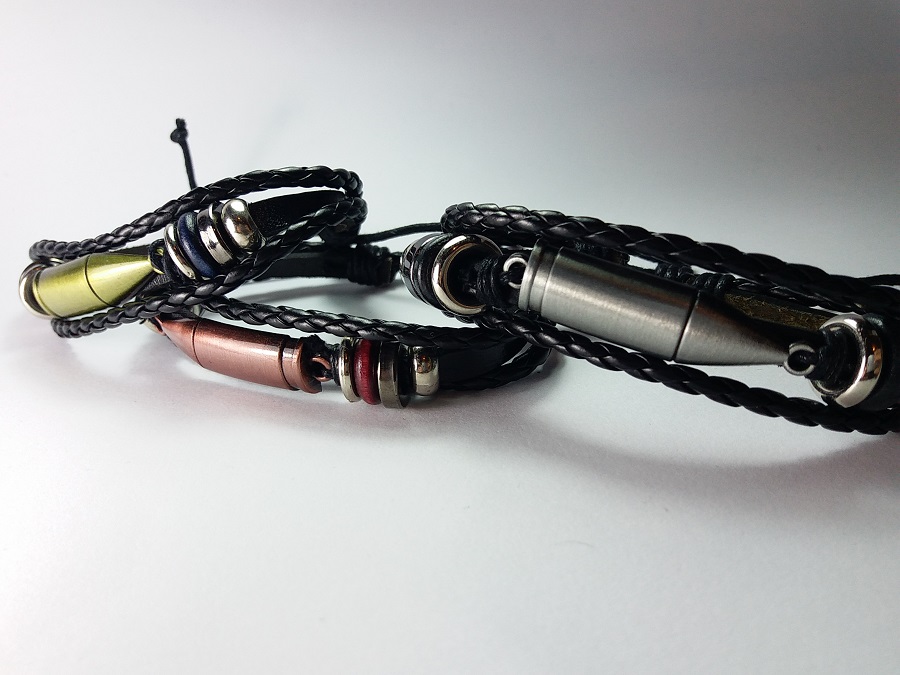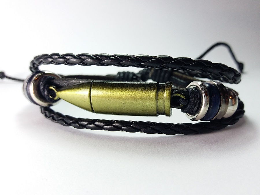 Metak Kožna Narukvica, dostupna u tri boje kao na slikama. Pored mnogobrojnih privezaka vezanih za oružje došao je red da vas obradujemo i jednom narukvicom. Vrlo je lagana, metak je dimenzija 3.8 x 1 cm. Narukvica je minimalne dužine 18 cm a može se proširiti na preko 30 cm.