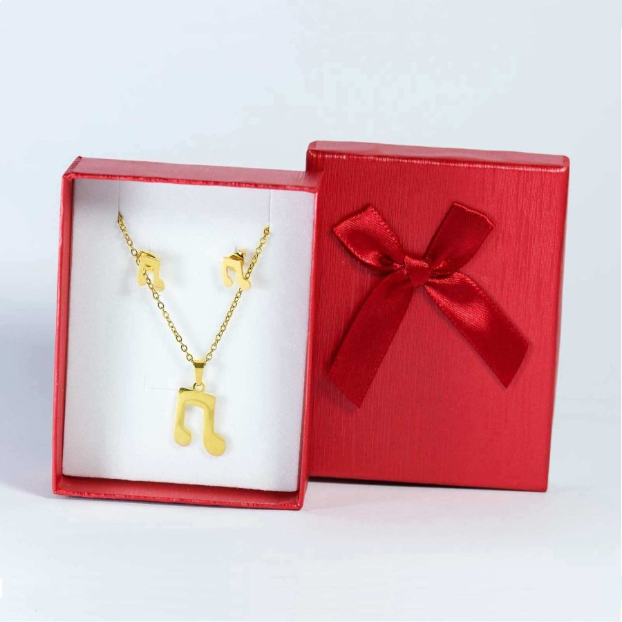 Komplet ogrlica i minđuše u obliku muzičke note. Minđuše su dimenzija oko 8 x 8 mm, ogrlica je dužine 45 cm a privezak je dimenzija 15 x 15 mm. Na poklon dobijate ukrasnu kutiju u nekoj od trenutno dostupnih boja.
