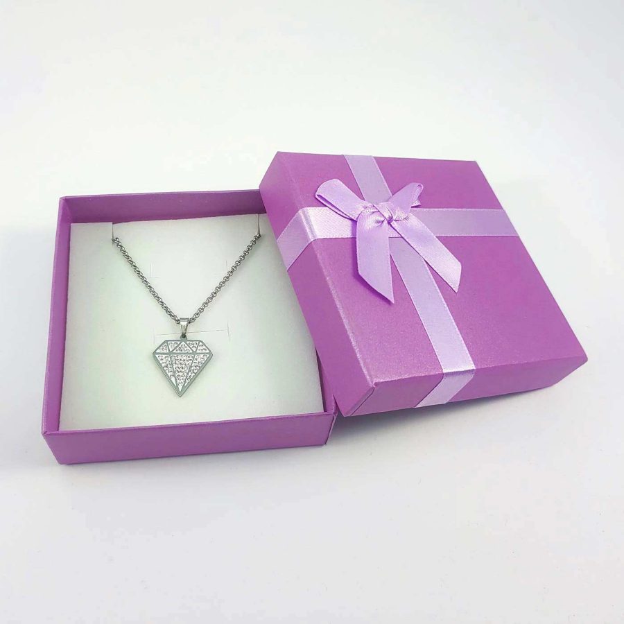 Lančić sa priveskom u obliku dijamanta, prekriven cirkonima. Dimenzije priveska su 20 x 20 mm, lančić je dužine 45 cm + 5 cm produžetak. Kupovinom ovog modela dobijate i ukrasnu kutiju u nekoj od trenutno dostupnih boja.