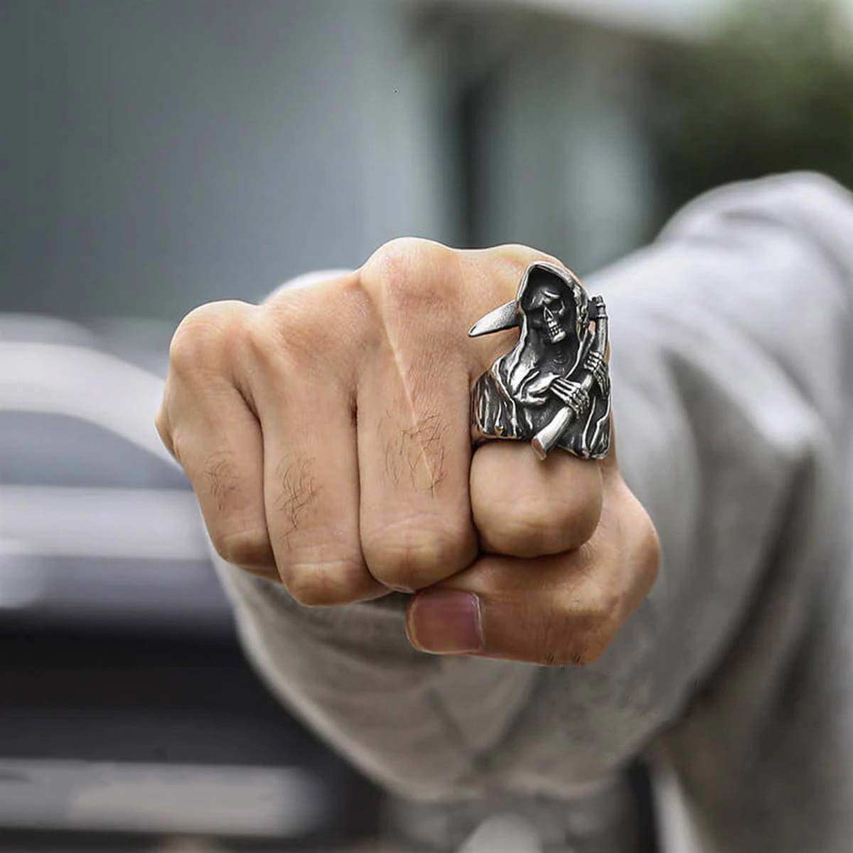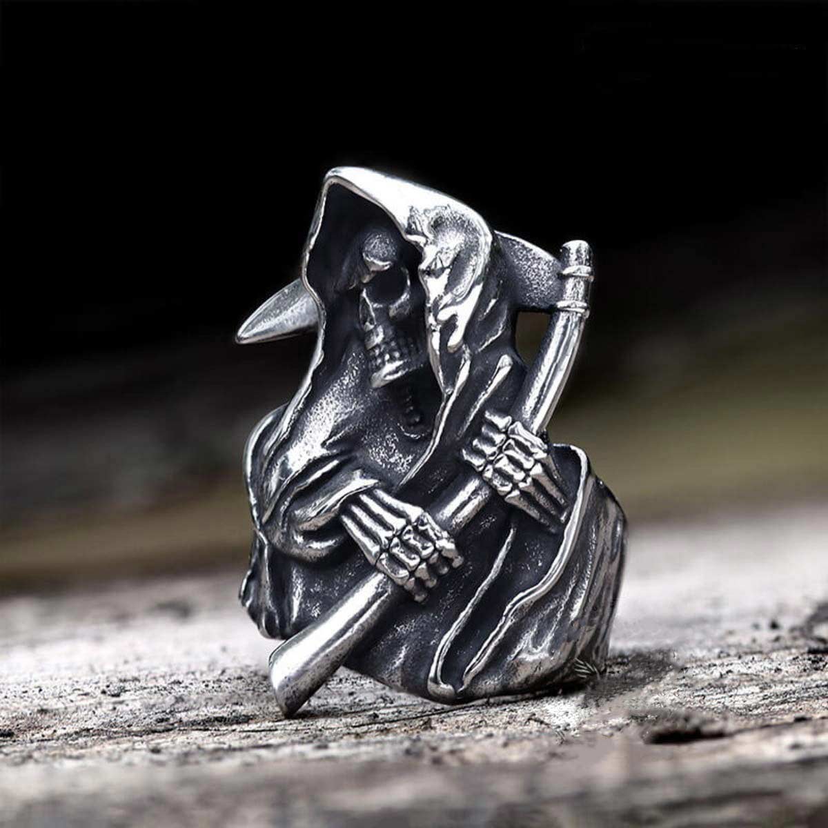 Prsten za muškarce reaper iz premium serije oduševiće bajkere ali i sve ostale koji nose ovaj tip nakita. Svaki detalj je savršeno urađen, uživo izgleda isto kao i na slikama. Dostupan je u veličinama 18, 19, 20 i 21 mm unutrašnjeg prečnika.